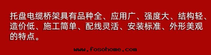 适用(yòng)範圍:托盤式電(diàn)缆(lǎn)橋(qiáo)架是(shì)石(dàn)油(yóu)、化(huà)工、輕(qīng)工、電(diàn)視、電(diàn)訊等方(fāng)面(miàn)應(yìng)用(yòng)廣泛的(de)一(yī)種(zhǒng)。它(tā)具有(yǒu)重(zhòng)量(liàng)輕(qīng)、载(zài)荷大(dà)、造型美(měi)觀、結构簡單、安(ān)裝(zhuāng)方(fāng)便,散(sàn)热(rè)透气(qì)性好(hǎo)等優点。它(tā)即适用(yòng)于(yú)動(dòng)力電(diàn)缆(lǎn)的(de)安(ān)裝(zhuāng),也(yě)适合于(yú)控制電(diàn)缆(lǎn)的(de)敷設。